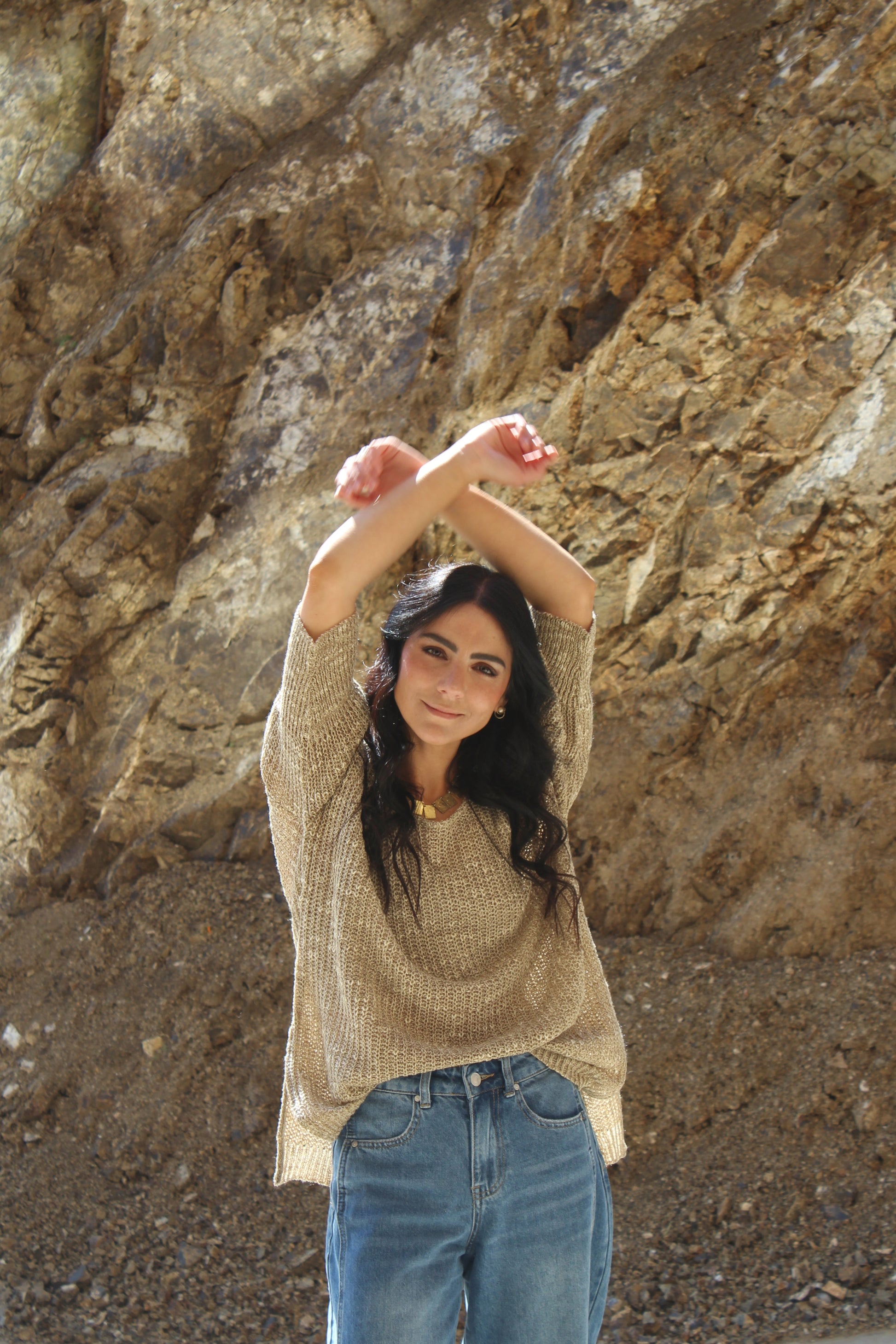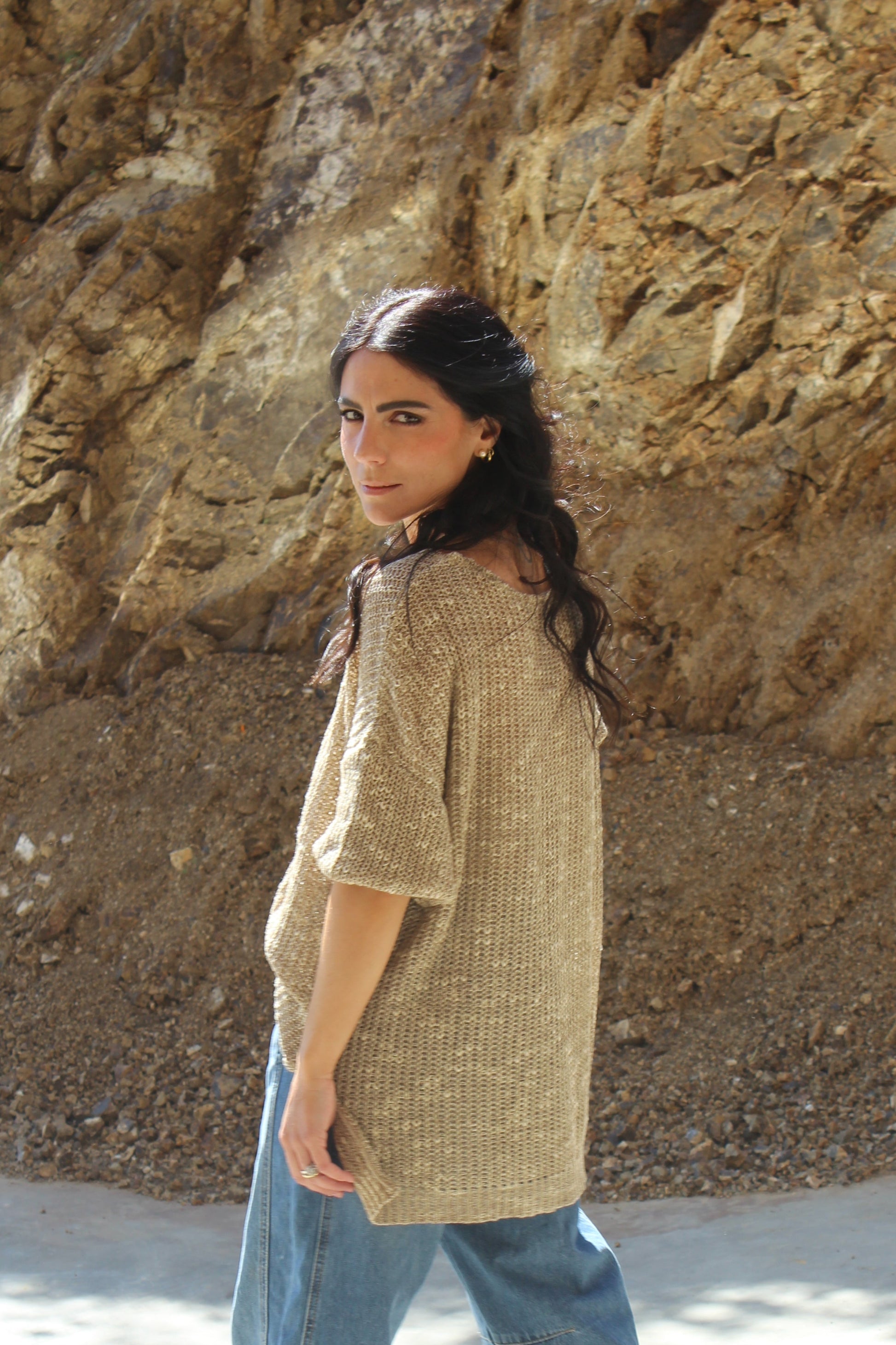 Con detalle en los puños que hace efecto manga aglobada y escote redondo